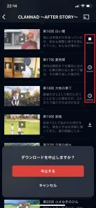 ダウンロードを中止したい作品のダウンロードアイコンをタップすると、「ダウンロードを中止しますか?」とポップアップが表示されるので、「中止する」を選択する。
